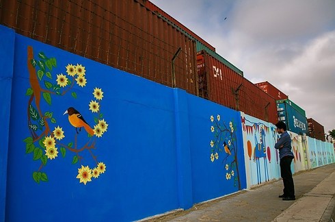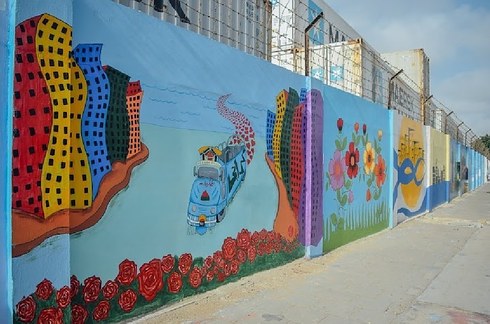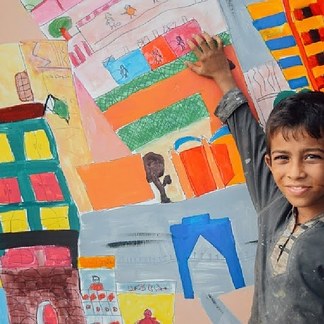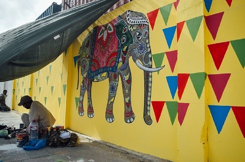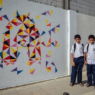 Students of Indus Valley School painting a wall at MT Khan Road, Karachi.