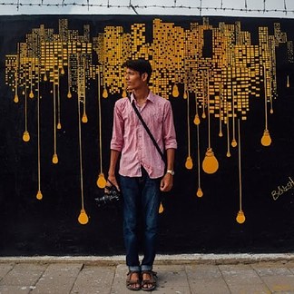 Sheikh Mohammed Zakir standing next to the wall he painted.